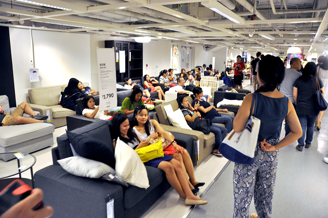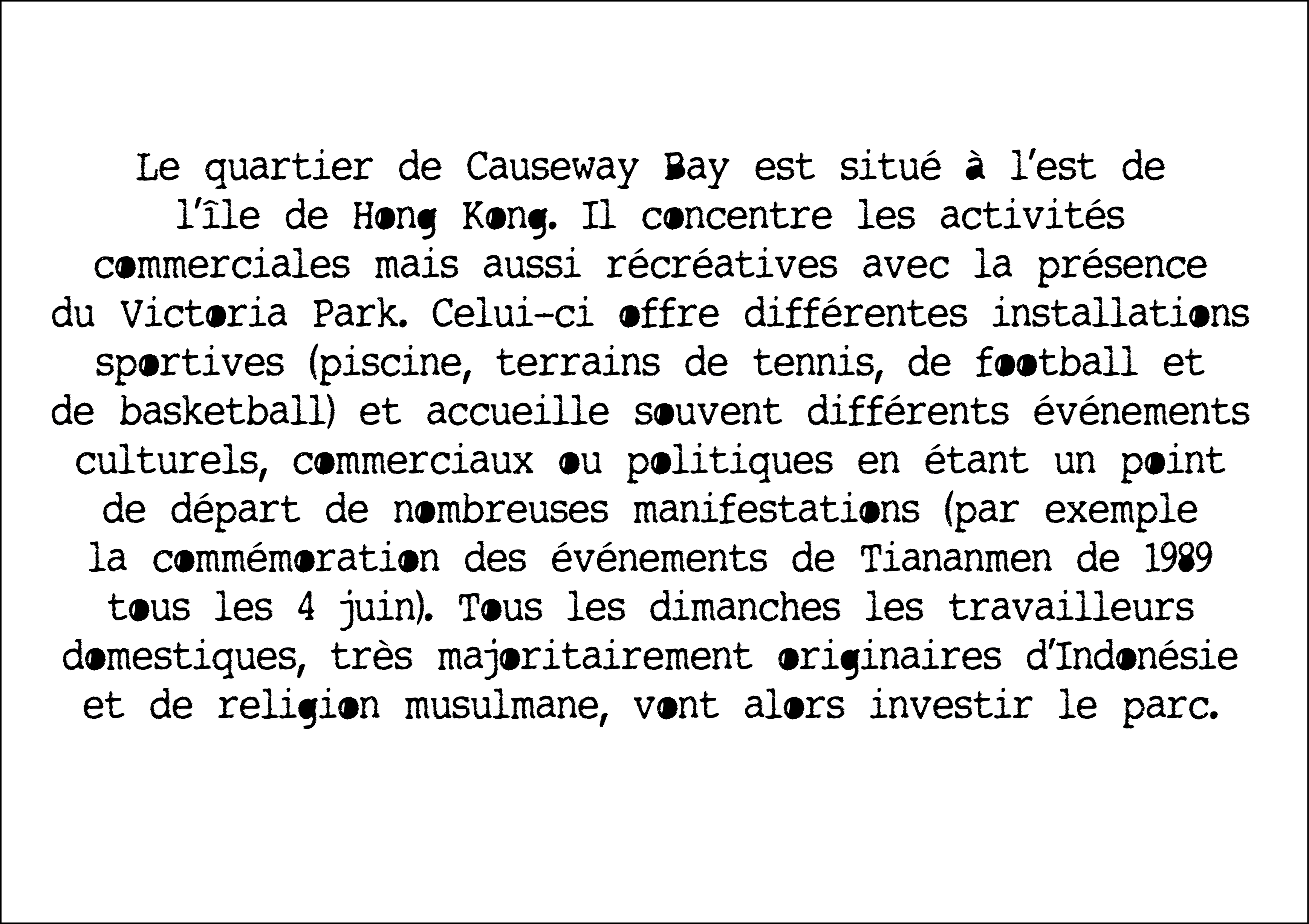 Les photos présentent les mêmes espaces à des moments différents de la semaine afin de souligner leur réversibilité. La première partie du portfolio présente le quartier des affaires de Central qui regroupe plutôt les travailleurs originaires des Philippines. L’espace le plus emblématique étant l’atrium au pied de la tour de la banque HSBC. Et la seconde partie du portfolio expose le quartier commerçant de Causeway Bay avec le parc de Victoria et ses abords qui regroupent plutôt les travailleurs originaires d’Indonésie. Toujours dans ce même quartier le magasin Ikea fait aussi l’objet d’un détournement de ces usages avec son espace d’exposition des canapés qui devient un lieu de repos et de discussion dans le confort de la climatisation.