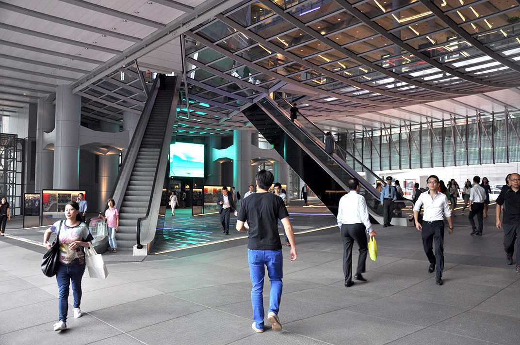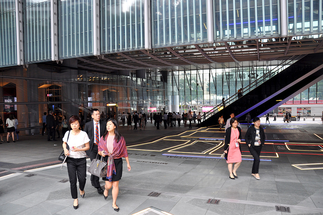 Couverture : Atrium de la tour HSBC sur Queen’s Road un dimanche. Les travailleurs domestiques s’installent sur un espace clairement délimité depuis le réaménagement de l’espace public pour rénovation à la suite du mouvement « Occupy » (Douay, 2015)
