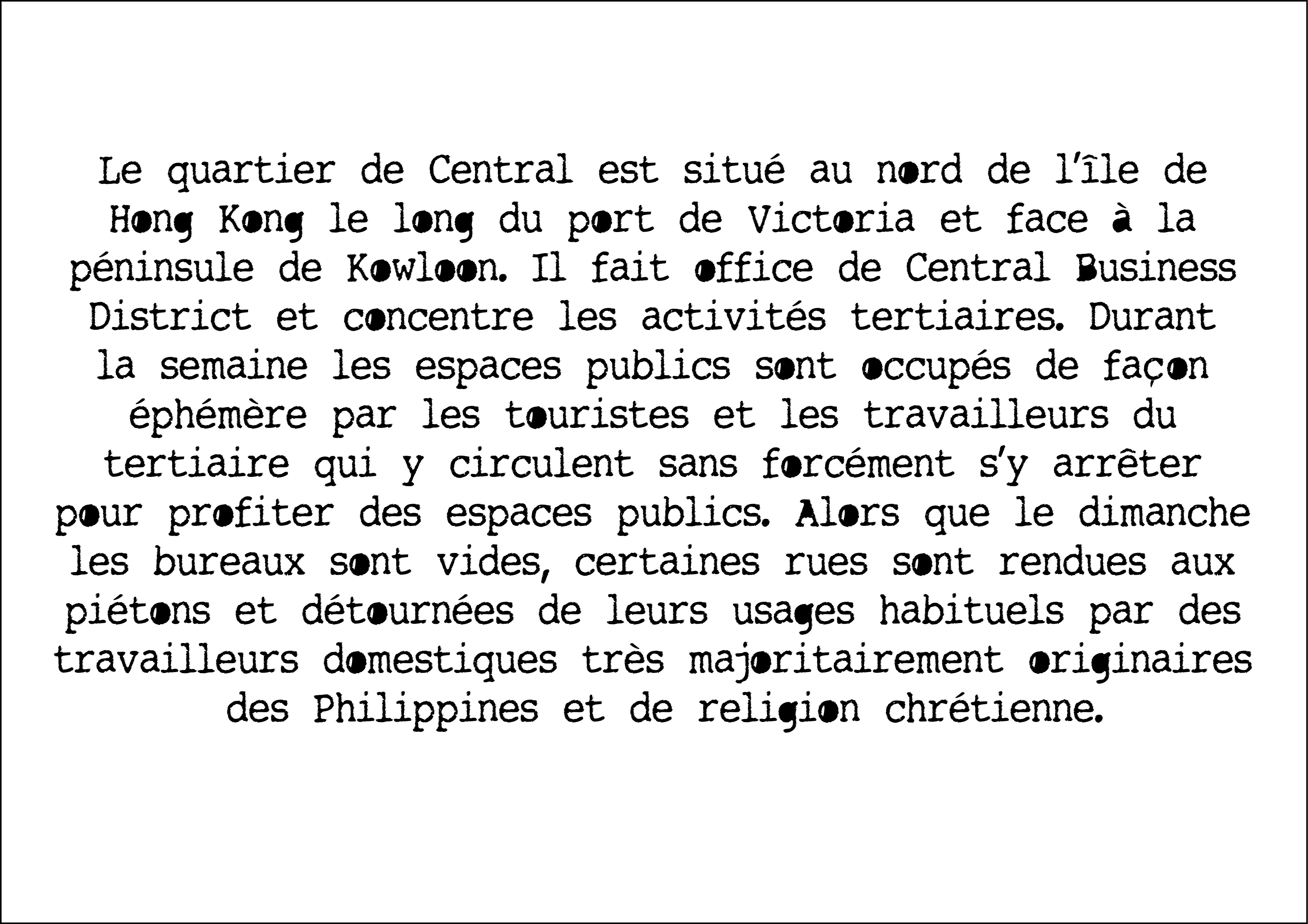 L’objectif de ce portfolio est de présenter la réversibilité dans le temps des espaces publics, investis par des usages et des publics différents. Cette dualité urbaine n’est pas propre à Hong Kong mais dans ce cas cela permet d’illustrer deux facettes de la globalisation et de l’avènement de cette ville au statut de World-City en mettant en avant les travailleurs souvent invisibles de cette prospérité.