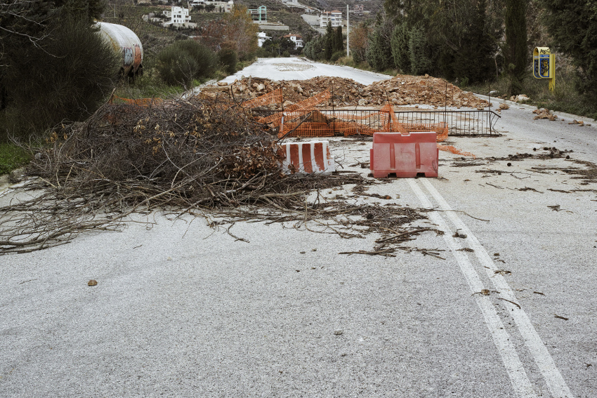 Parallèlement au retrait des activités commerciales et des affichages promotionnels, la détérioration des voies de circulation témoigne d’un asséchement qui provient, pour sa part, de la contraction des finances publiques. Si à l’échelle de la métropole, l’état général des revêtements routiers ne s’est pas clairement dégradé, il n’en demeure pas moins qu’à la suite d’intenses précipitations certaines voies ont été endommagées et, faute de réparations, sont devenues impraticables. Axe central traversant le lotissement de Drafi, situé dans les périphéries aisées du nord-est d’Athènes, l’avenue Achaion constitue un des cas les plus significatifs de ces dégradations. Déformée, crevassée, érodée, en partie écroulée depuis le mois de février 2013, cette voie n’a pas été rouverte à la circulation, alors même qu’elle relie plusieurs communes urbanisées. Au-delà des circonstances locales et météorologiques qui sont à l’origine de son délabrement, l’avenue Achaion est d’ailleurs à même de symboliser les décrochements et érosions qui parcourent la société et la capitale grecques. À travers elle transparaissent toutes les fissures plus ou moins mineures et majeures, articulées ou isolées, d’ordre économique, politique, sociétale et domestique, qui se sont formées, mais qui ne font pas systématiquement trace dans la géographie.
