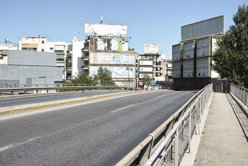 Cette raréfaction des activités de construction explique une partie de la récession économique, en Grèce comme dans la métropole athénienne. Elle en est également un de ses prolongements, comme le sont d’autres phénomènes de renoncement ou repli qui s’ancrent dans les topographies urbaines. Le recul démographique, le fléchissement des prix immobiliers, la vacance des locaux commerciaux, le faible usage des espaces publicitaires ou, de manière tout aussi importante, la baisse de la consommation pétrolière et la dégradation partielle du réseau viaire se reflètent in situ et donnent à voir la diversité des tarissements et éclatements. Si la Grèce a perdu environ 200 000 habitants de 2011 à 2014, la majeure partie de cette diminution est en provenance de l’Attique, la population y ayant diminué de 140 000 habitants en quatre ans. De 2008 à 2014, les prix d’achat des logements ont décru d’environ 40 % en Grèce et de 33 % à Athènes, tandis que la valeur des locaux commerciaux s’affaissait de 40 à 70 %. Dans la plupart des quartiers et communes de la métropole, 20 à 40 % des locaux commerciaux étaient fermés en septembre 2014, dont 27 % dans l’hypercentre d’Athènes. Dans un pays où les déplacements urbains et le chauffage domestique sont structurellement fondés sur l’utilisation de produits pétroliers, les ventes d’essence et de fioul ont respectivement chuté de 2009 à 2013 de 35 % et 67 %. Une pratique étendue et régulière des rues de la capitale peut même conduire à remarquer que les niveaux de consommation se sont si largement affaiblis que l’affichage publicitaire est devenu accessoire, ou du moins que les panneaux correspondants ne répondent qu’à des demandes sporadiques.