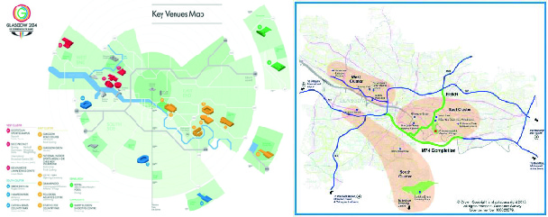 Sources : http://worldsportsandhospitality.com/glasgow-2014-commonwealth-games-venues.html (carte 2) et Strategic Environmental Assessment (SEA) of the Glasgow 2014 Commonwealth Games Strategy and Framework, November 2010, http://www.glasgow.gov.uk/CHttpHandler.ashx?id=16539&p=0 (carte 3).