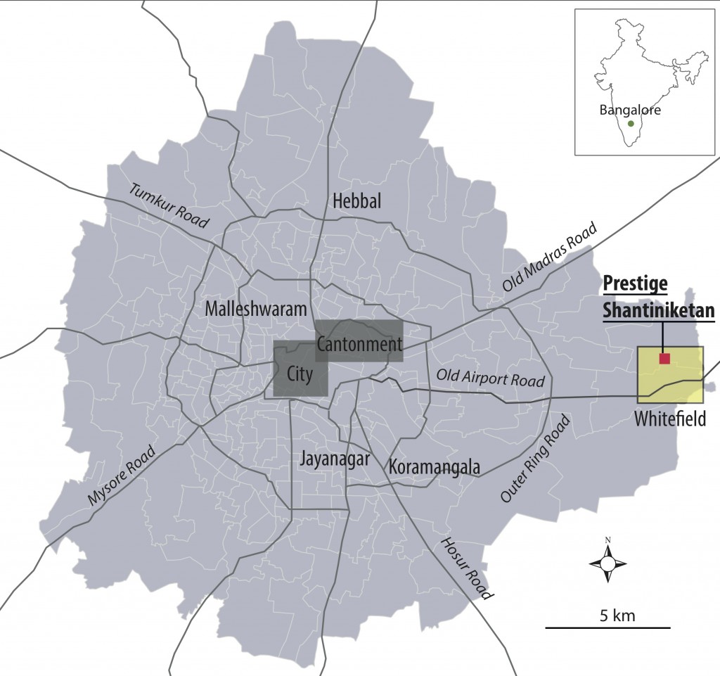 En février 2005, Irfan Razack, directeur de Prestige Estates Projects3 , annonce la vente-sur-plan de 2 800 appartements qui doivent être construits à Whitefield, c’est-à-dire au cœur d’une banlieue technopolitaine située à une vingtaine de kilomètres du centre historique de Bangalore (Rouanet et Varrel 2014).