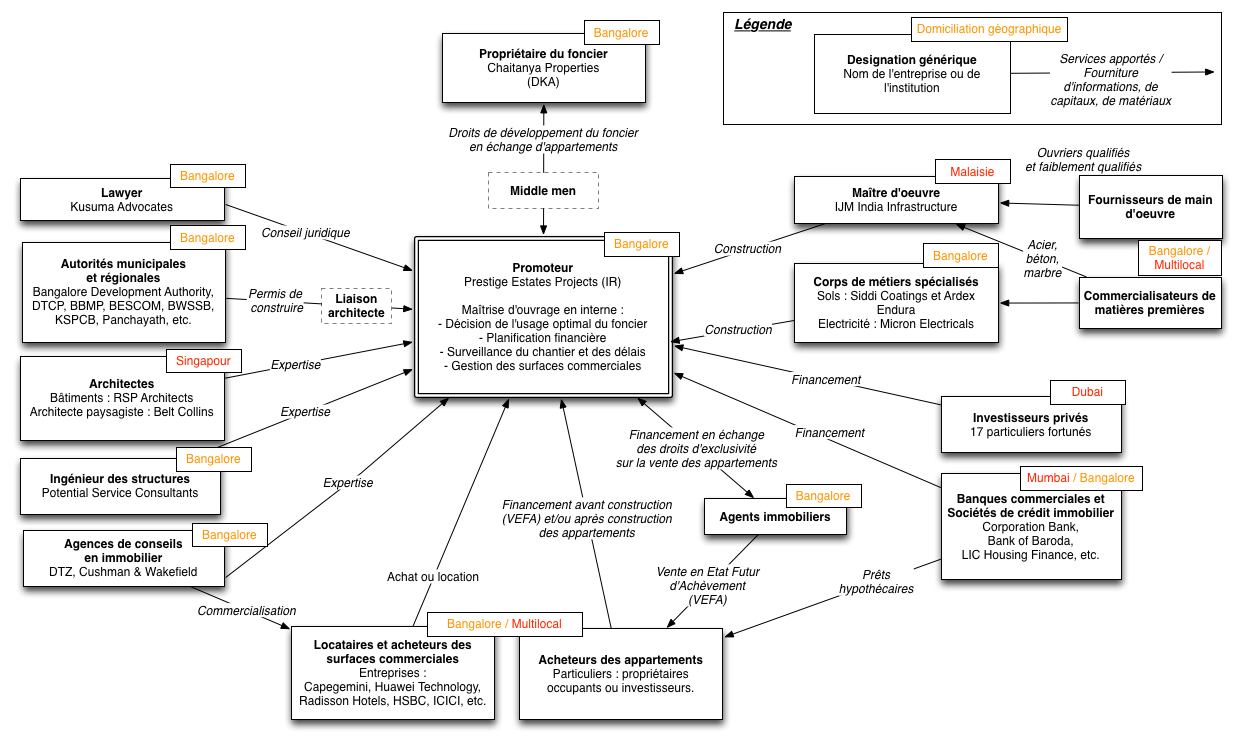 Schéma 1 : La fabrication de Prestige Shantiniketan. Le promoteur immobilier, au centre d’un réseau socio-professionnel hétérogène. Réal : Hortense Rouanet, 2015