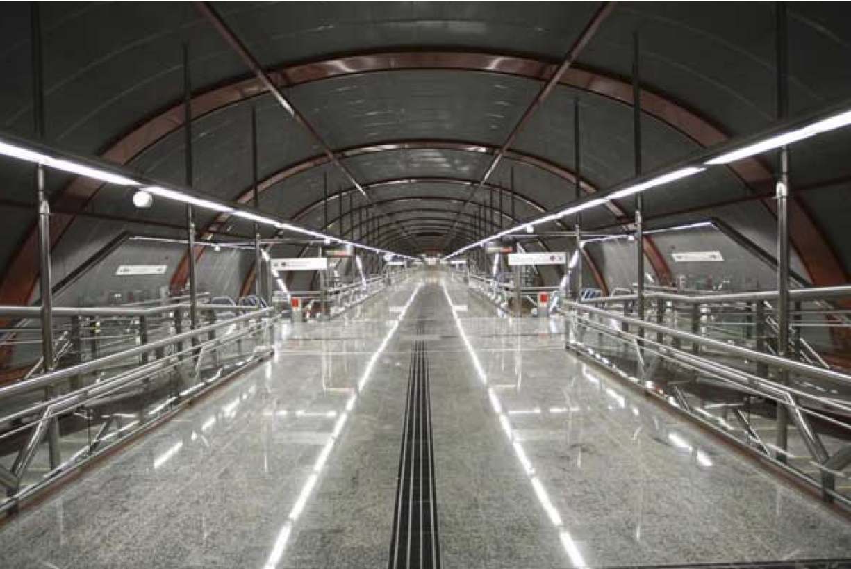 Le vestibule permettant l’échange entre les quais du métro et du train de banlieue s’étend sur 7500 mètres carrés : il forme comme une véritable caverne de plus de 200 mètres de long, 20 de large et 15 de hauteur, sous la surface de la place. Mais cet espace avant tout technique est relié symboliquement à la place au-dessus par la valorisation des restes archéologiques de l’Eglise de Buen Suceso. (Source : Ministerio do Fomento)