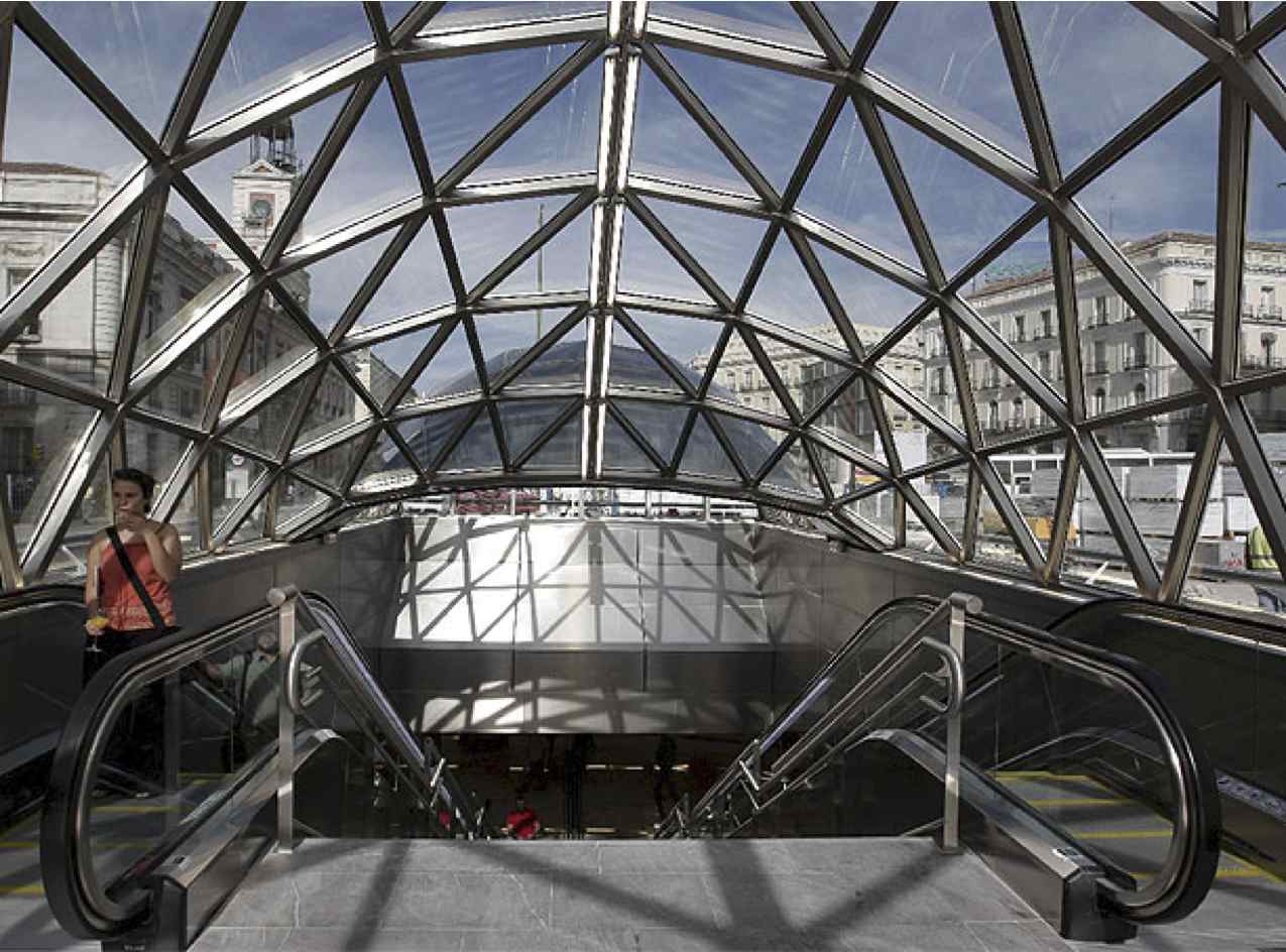 Une grande verrière aux formes arrondies émerge de la place dans la nouvelle configuration 2009. Elle constitue un puits de lumière pour les étages inférieurs et, en même temps, intègre visuellement le paysage urbain de la place, ses façades dans l’espace du transport. (Source : Comunidad de Madrid).