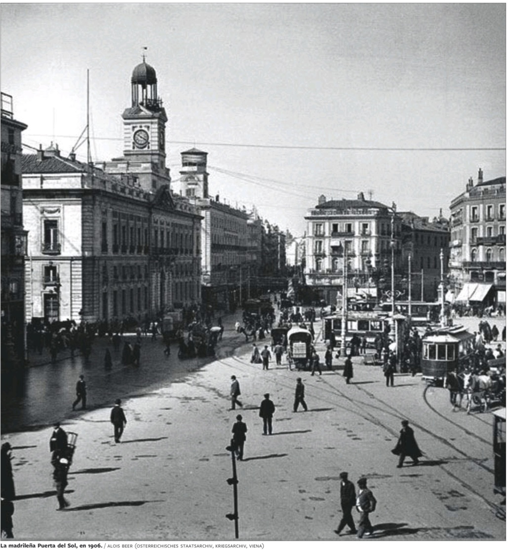 En 1906, la place est bien au carrefour des plus belles avenues de Madrid, mais elle paraît largement encombrée de voitures et de voitures à cheval, ainsi que de lignes de tramways (qui disparaitront au début des années 1950). Les piétons traversent de manière anarchique. (source : Alois Beer, Osterreichische Staatsarchiv, Vienne).