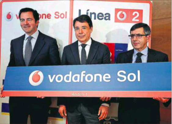 Revenons sur le contexte dans lequel on a réaménagé cette place (Baron 2010). La décision en a été prise par deux élus du parti populaire, le maire de Madrid (Alberto Ruiz-Gallardón) et la Présidente de Région (Esperanza Aguirre) au début des années 2000. Leur projet commun était de faire accéder cette capitale à un statut de ville globale grâce à de coûteux aménagements immobiliers et de mobilité. Le projet de Sol (la réfection de la place et l’échangeur) coûtait plus de 570 millions d’euros et constituait l’un des emblèmes de cette modernisation accélérée de la capitale. Les élus ont d’ailleurs dû avoir recours au marketing et à l’appui des partenaires privés, en rebaptisant « Samsung Sol » (courant 2011), puis « Vodafone Sol » (depuis 2013) les quais de la station souterraine au niveau de la ligne de métro n°2.