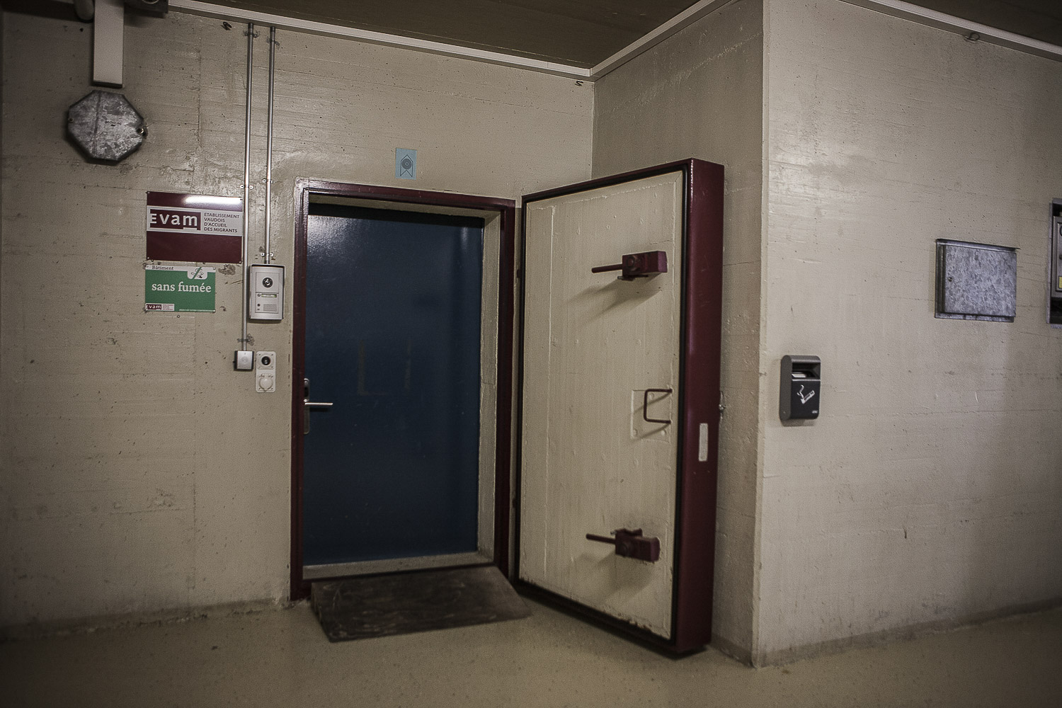 10. La porte bleue permet l’entrée dans le centre. Pour y avoir accès il est nécessaire de s’annoncer en appelant l’agent de sécurité par interphone. La lourde porte de la structure antiatomique n’est, elle, jamais fermée.