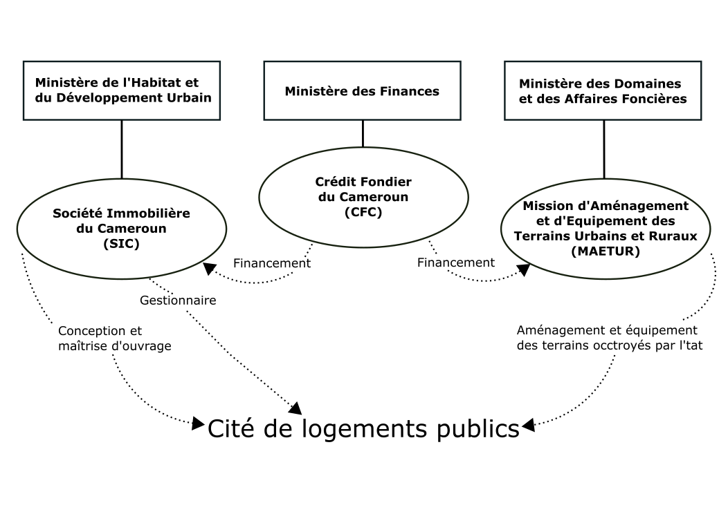 Ces politiques d’habitat sont mises en œuvre par un appareil administratif complexe établi par décrets en 1977 (voir figure 1). Les statuts et les prérogatives de la SIC sont revus. En qualité d’entreprise parapublique, elle doit proposer les projets de cités3 de logements sociaux, en encadrer la réalisation, puis en assurer la gestion pour l’État. Le financement public est assuré par le biais du Crédit Foncier du Cameroun (CFC). Enfin, ce dispositif institutionnel, désigné comme le « triptyque de l’habitat », est complété par la création de la Mission pour l’Aménagement et l’Équipement des Terrains Urbains et Ruraux (MAETUR), qui a pour tâche d’aménager les espaces accueillant des lotissements.