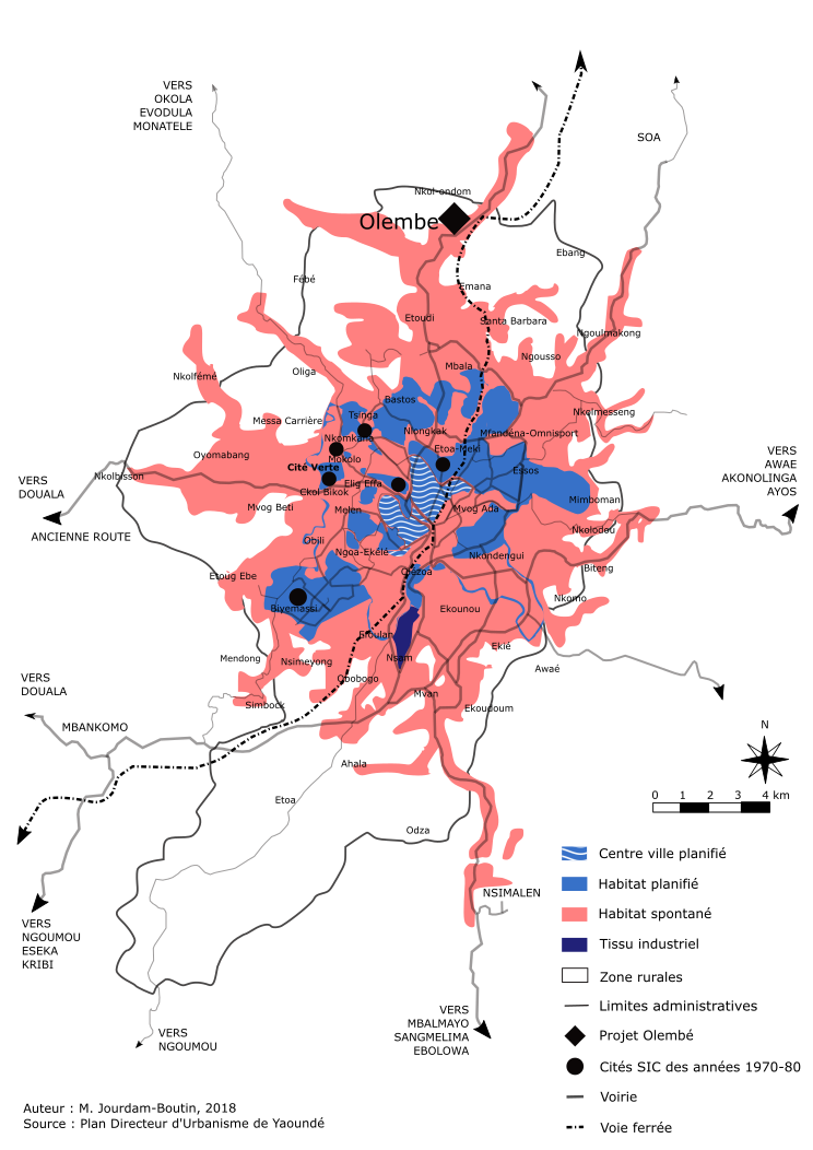 4. Carte de localisation des cités SIC et du projet Olembé dans le tissu urbain de Yaoundé (M. Jourdam-Boutin, 2018)