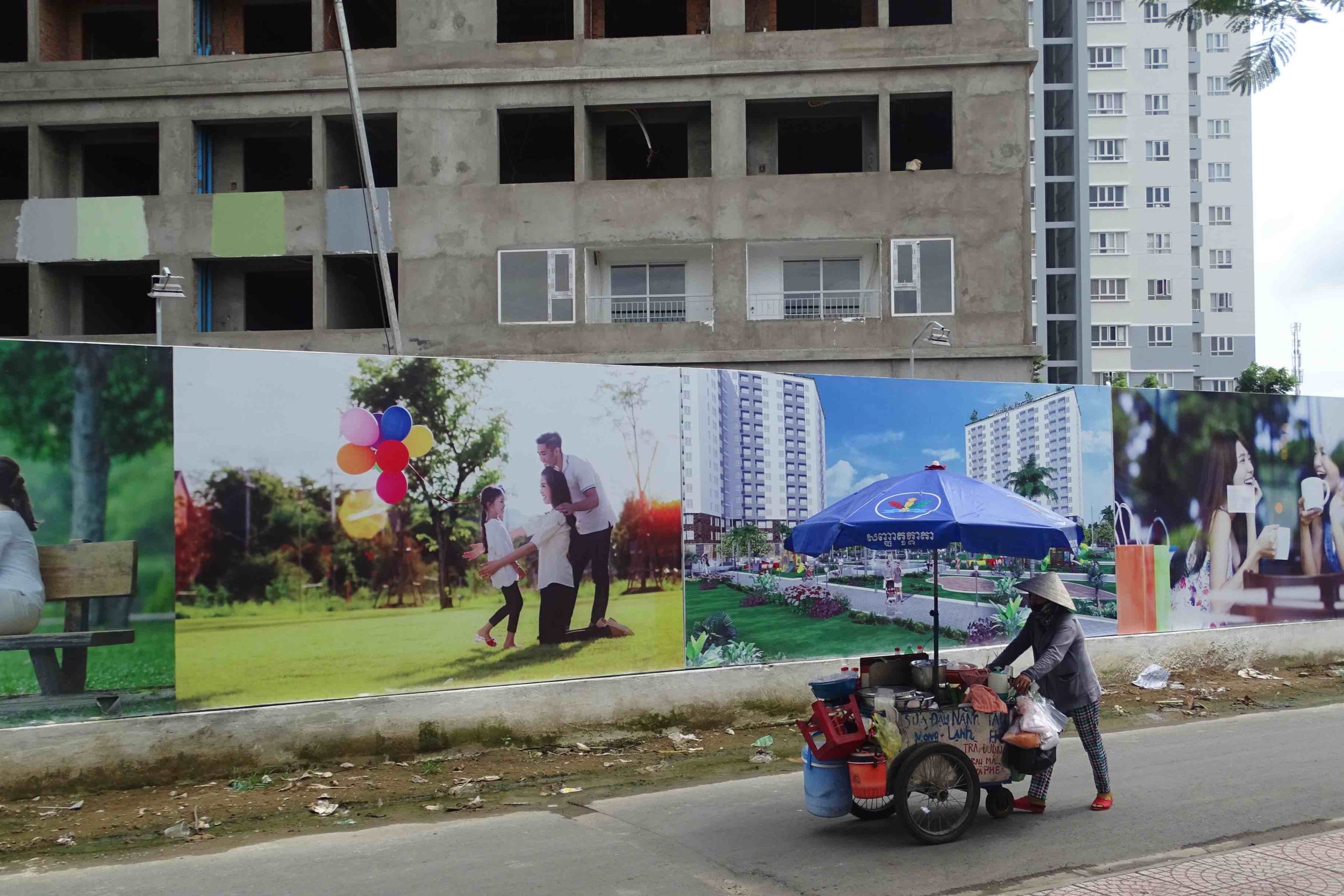 Le contraste entre les tours du projet Starlight Riverside en construction (district 6, Ho Chi Minh Ville) et son environnement social et architectural immédiat (M. Gibert-Flutre, 2017)