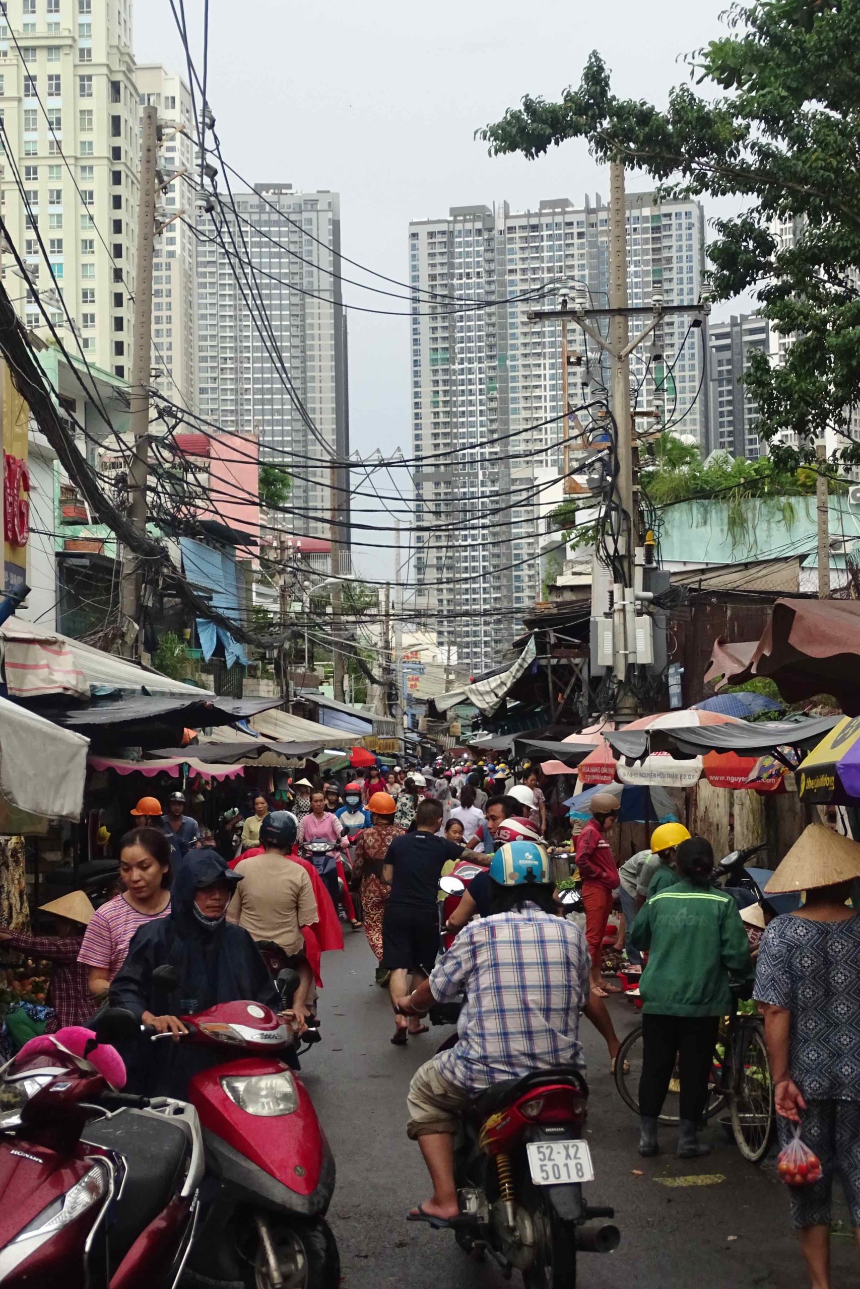 4. Le marché populaire de la rue Võ Duy Ninh (district de Bình Thạnh à Ho Chi Minh Ville), avec en arrière-plan les tours du grand projet Vinhomes Central Park, (M. Gibert-Flutre, 2017)