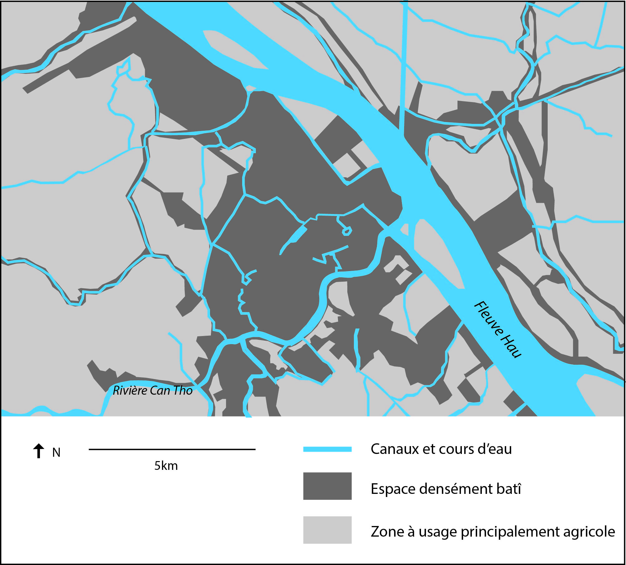 3. Tâche urbaine de l’agglomération de Can Tho et principaux canaux et cours d’eau de surface identifiés à partir d’une image satellitaire (Clara Jullien, 2020)