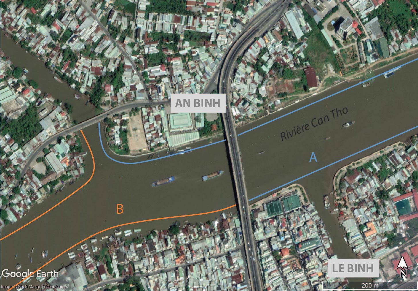 7. Les projets d’endiguement du fleuve Can Tho dans la périphérie sud-ouest de la municipalité de Can Tho A – Projet d’endiguement achevé financé par la Banque Mondiale B – Projet d’endiguement en cours financé par l’Agence Française de Développement (Clara Jullien, 2020)