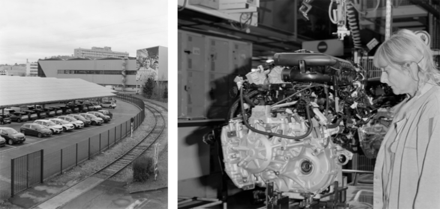 Gauche. « Nous construisons le Sochaux de demain » Vu de l’usine – entrée Montbéliard (Romain Cavallin, Avril 2017) Droite. Usine de PSA, réglage moteur (Romain Cavallin, Décembre 2017)