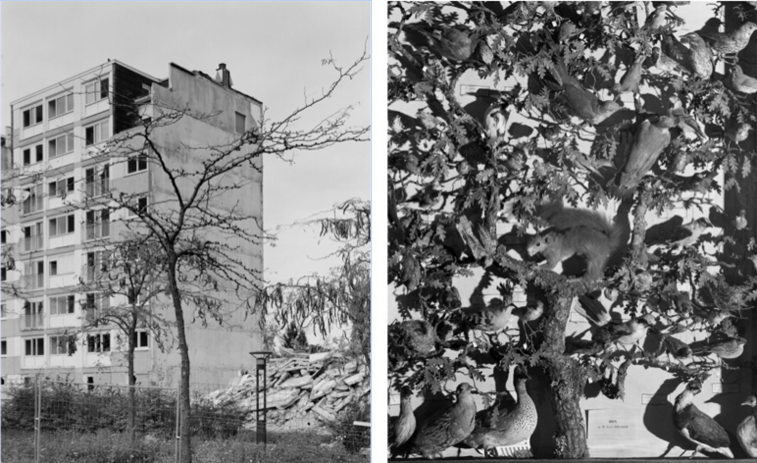 Gauche. Zone d’urbanisation Prioritaire (ZUP) de Montbéliard. Après la baisse des emplois ouvriers dans la région certains bâtiments sont détruits dans le but de recréer des espaces verts. Droite. Taxidermie de Louis Peugeot – Musée du château de Montbéliard (Romain Cavallin, Novembre 2017)