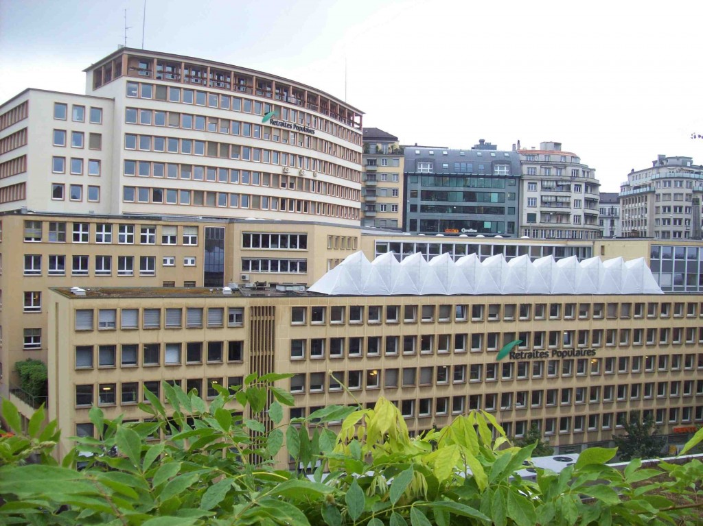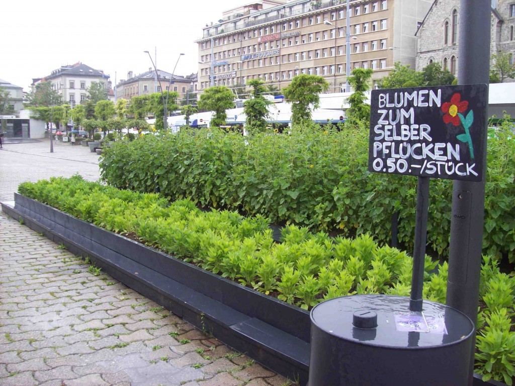 Place de la Riponne, des rangées de plantations qui offrent leurs fleurs « en libre-service » (Francou, 8 juillet 2014)